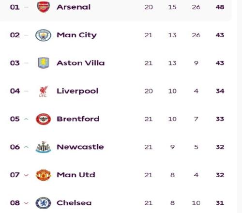 而在曼联和切尔西近况低迷的情况下,两大黑马布伦特福德和纽卡斯尔,凭借本轮关键性胜利,挤掉两队升至英超前6名。