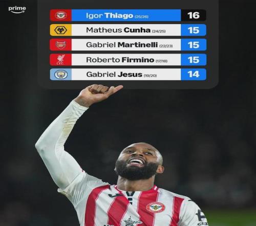 北京时间1月8日,英超第21轮,布伦特福德主场3-0击败桑德兰,排名暂时升至英超第5位。本场比赛,布伦特福德前锋伊戈尔-蒂亚戈上演梅开二度好戏,在射手榜上以16球的成绩紧追曼城神锋哈兰德。与此同时,伊戈尔-蒂亚戈单赛季16球的表现,也打破了巴西球员单赛季英超最多进球纪录。
