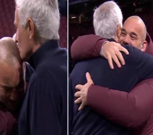 欧冠赛前穆里尼奥与两名昔日弟子重逢,并亲吻了斯内德的光头
